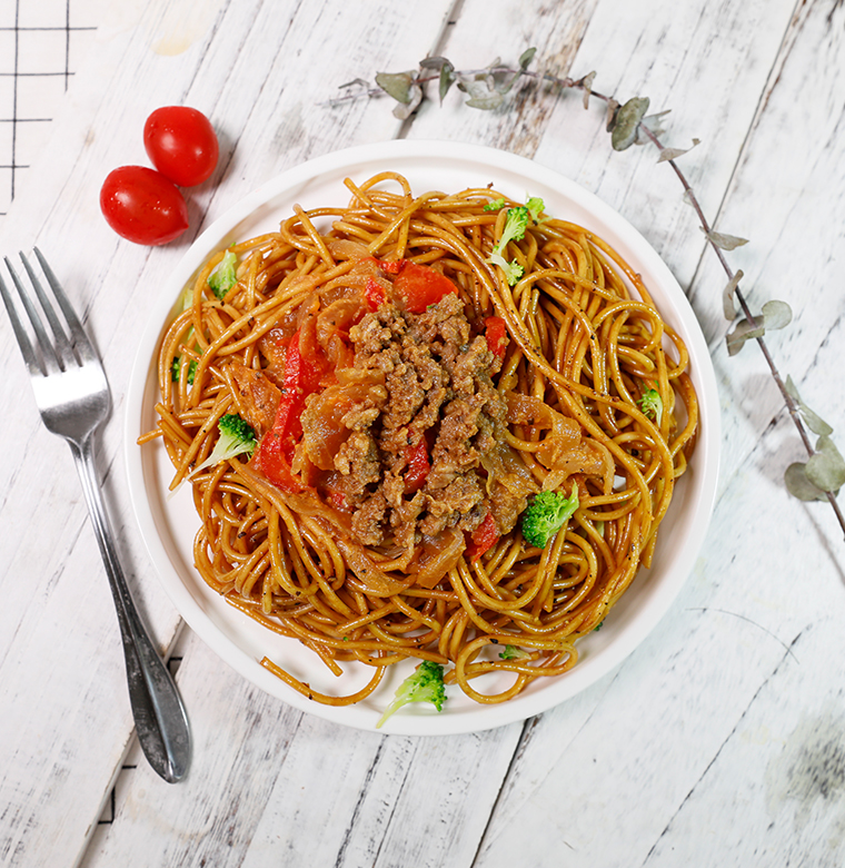 意大利面、洋蔥、牛肉、紅彩椒